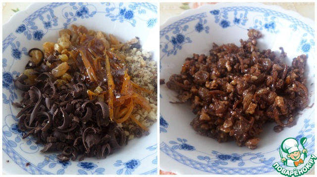 В чашку выкладываем нарубленные орехи, распаренный изюм, натертый шоколад и цедру. Перемешиваем. Начинка готова.