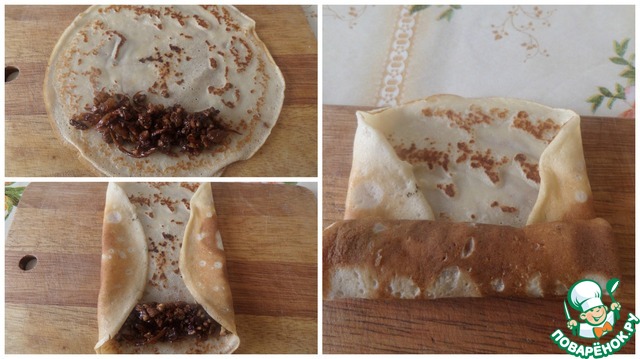 На край блина выкладываем начинку (1 ст. л.) и сворачиваем трубочкой.