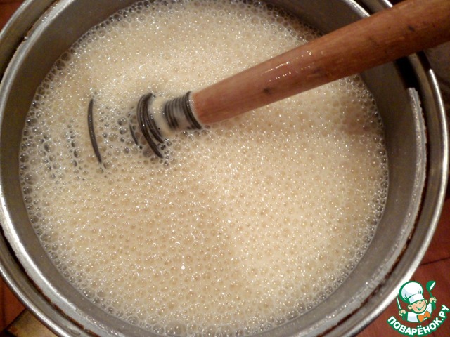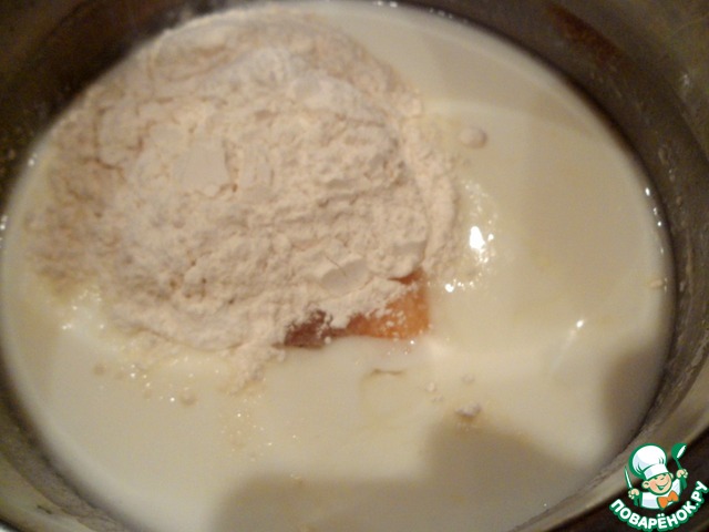 Вскипятить молоко и вылить в кефирную массу, помешивая венчиком, добавить еще 1/2ст. муки, перемешать.