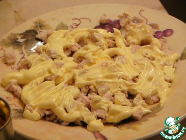 Нарезаем куриную грудку и укладываем её в подготовленное блюдо. Покрываем слоем майонеза