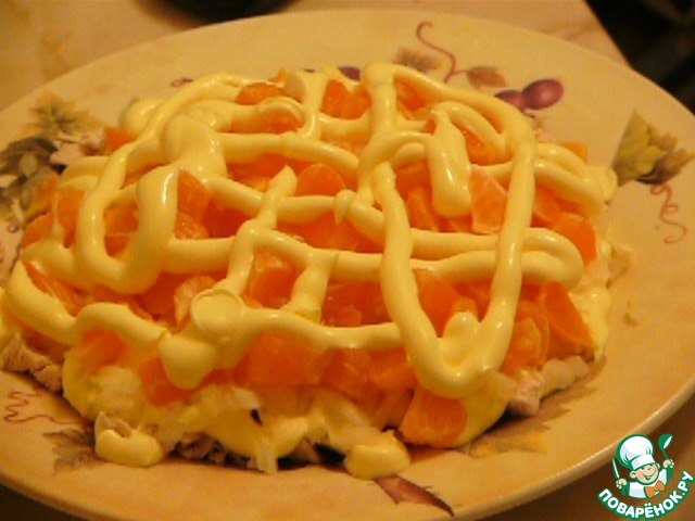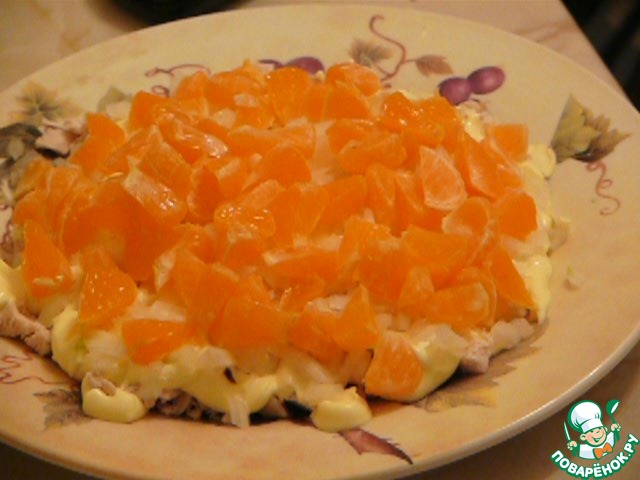 Очистим мандарины и нарежем их небольшим кубиком. Укладываем их на слой лука