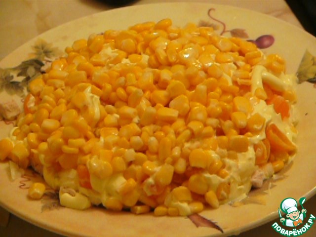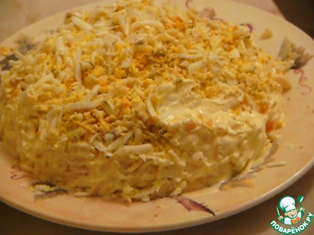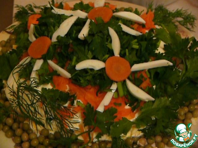 Последний слой салата -натёртая морковь. Украшаем салат горошком по кругу