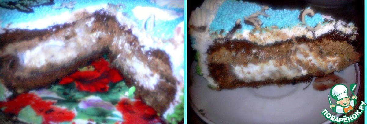 | Сочетание шоколадного шифонового бисквита, шоколадного тоффи, грильяжа и сливочного мороженого – это сказочно вкусный торт, который может украсить любой праздничный стол. Он будет уместен и на день рождения, и на новый год и на любой другой праздник. Главное в этом десерте внутреннее содержание, а украсить торт можно в зависимости от повода и вкуса. Это может быть глазурь, шоколад, орехи, кремовые цветы или как сегодня – кремовая аппликация мужу, бывшему десантнику на 23 февраля. |
