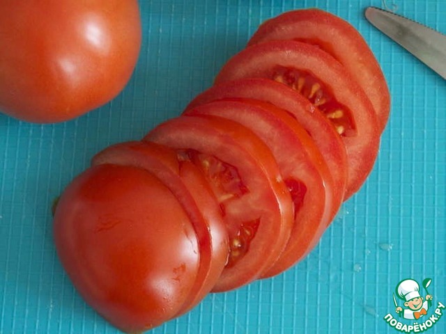 Спелые помидоры вымыть и нарезать тонкими кружочками. Может потребоваться и более 2-х штук.