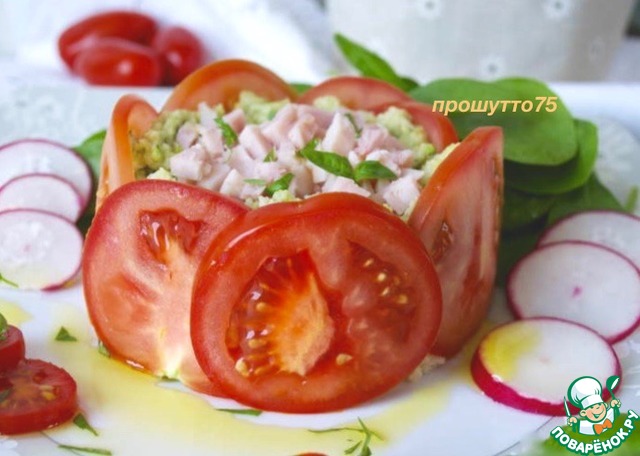 Заполнить формочку смесью с авокадо. В центре оставить углубление. Оставшуюся ветчину мелко нарезать кубиками и заполнить ими углубление в центре.