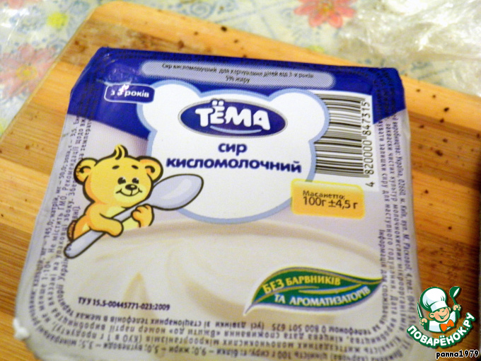 Каждый кусочек хлеба смазать сыром маскарпоне. Вот тут у меня начались проблемы - такого сыра, как и Филадельфии, в магазине не оказалось, поэтому пришлось срочно придумывать замену. Неплохим вариантом, на мой вкус, стали детский творожок "Тема" без наполнителей и творожок фирмы "Президент".