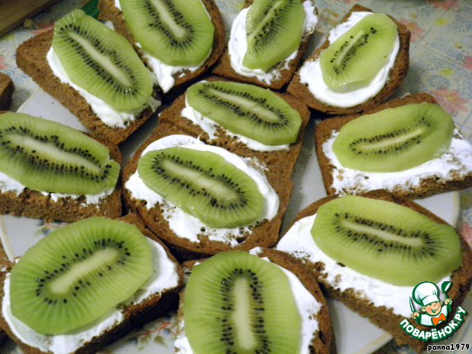 Спелые плоды киви очищаем от кожуры, режем тонкими ломтиками и выкладываем на смазанный сыром хлеб.