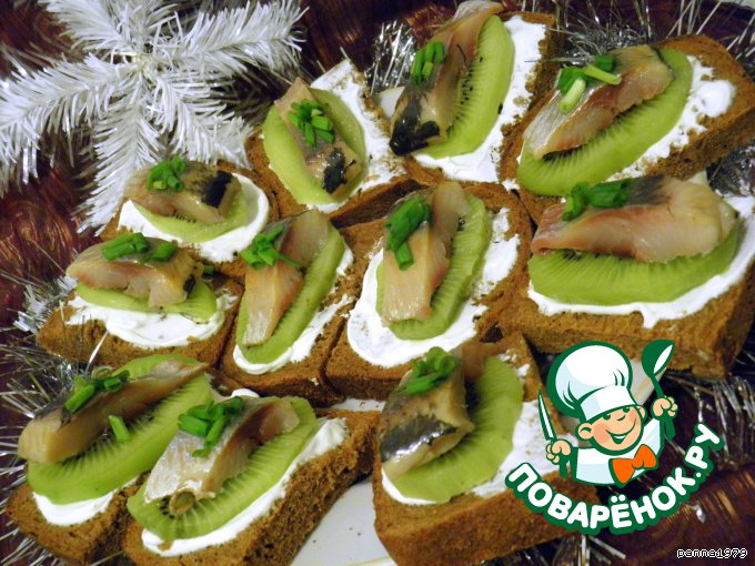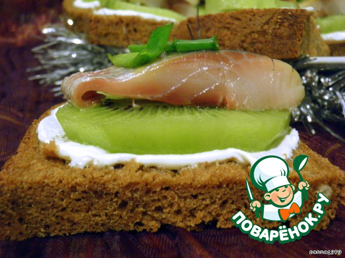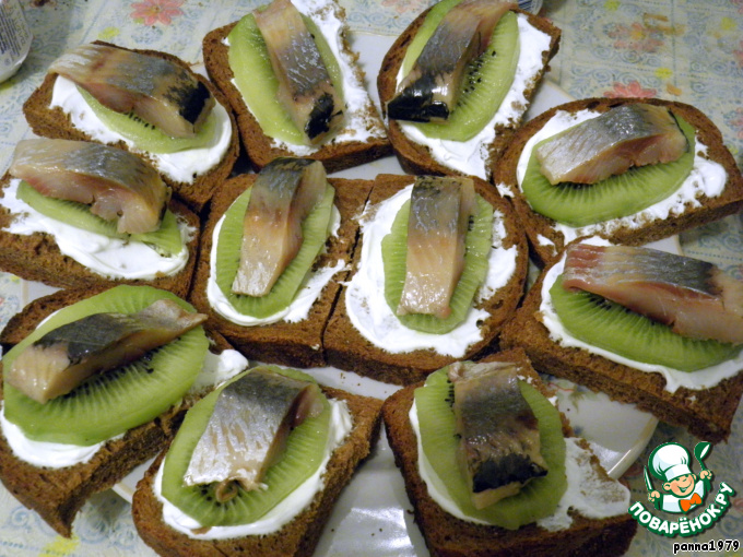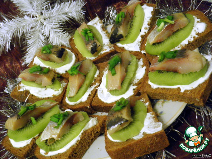Канапе получились очень интересными. Пряный хлеб, нежный сливочный сыр, сладкий с небольшой кислинкой киви и соленая сельдь - все вместе создали необыкновенный букет.