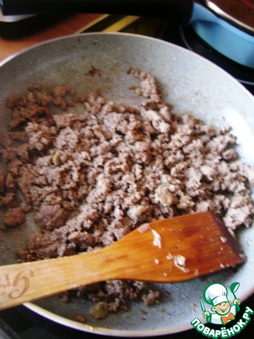 Для второй начинки обжарить фарш на чуть смазанной половиной масла сковороде до рассыпчатости и чуть коричневатого оттенка. Посолить по вкус, щедро присыпать черным перцем. Остудить и добавить шинкованный зеленый лук.