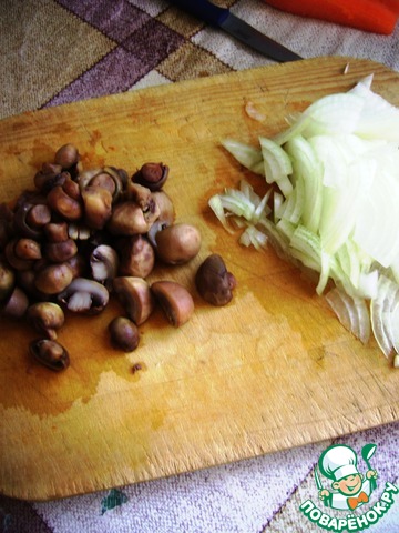 Для третьей начинки шампиньоны крупно порезать (мелкие оставить целыми) и тонко нашинковать остаток репчатого лука. Обжарить грибы до позолоты, добавить лук и жарить вместе, помешивая, до румяности. Посолить и поперчить. Остудить.