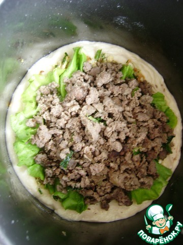 Выложить морковную начинку, оставляя свободным край под защип. Сверху начинку укрыть салатным листом. Затем уложить фарш и на него сверху –грибы с луком. Накрыть горку начинки вторым листом салата. Отщипнуть от остатка теста кусок примерно с яйцо, из остального раскатать круг и накрыть начинку. Хорошо защипать края, приподнимая низ.