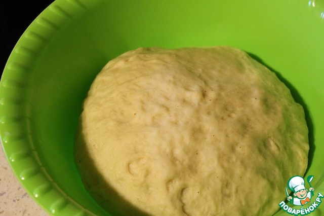Тесто скатать в шар, положить в глубокую миску смазанную 1\2 ч. л. растительного масла. Накрыть чистым полотенцем и оставить в теплом месте на 1.5 часа.