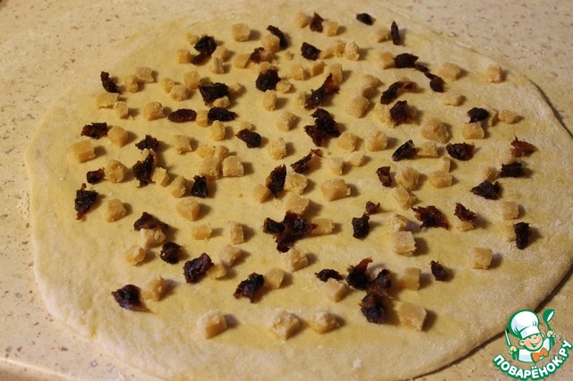 На присыпанной мукой поверхности раскатать тесто, толщиной 3-4 мм. Сверху выложить марципан и финики нарезанные мелкими кубиками.