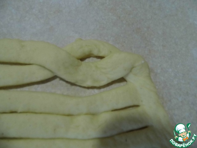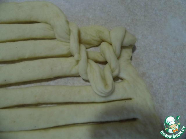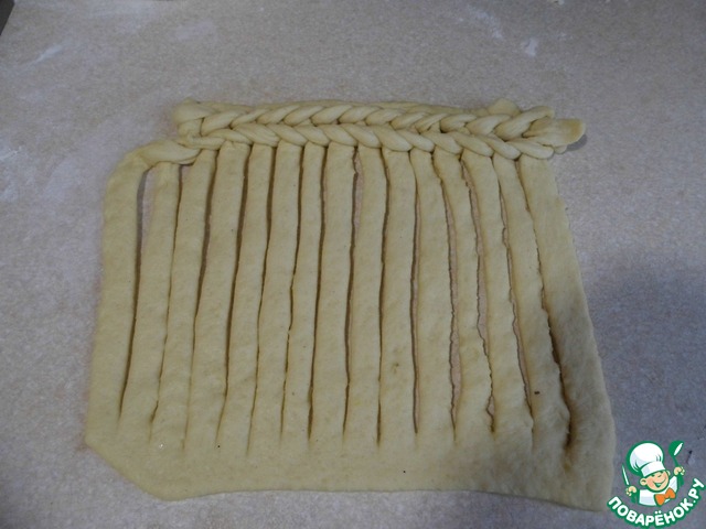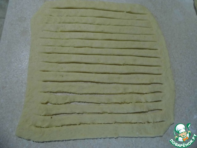 У меня получилось четыре ряда. Оставляем наш шарфик на присыпанной мукой поверхности еще немного подняться.