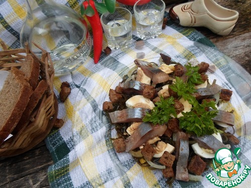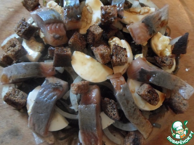 Следующей выкладываем сельдь, сверху салат посыпаем сухариками, поливаем соевым соусом.