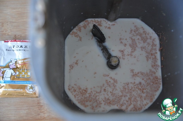 Для удобства замеса я использую хлебопечь. В ведро хлебопечи наливаем тёплое молоко, насыпаем сахар и дрожжи для сдобы от "Саф-момент", всё слегка взбалтываем.