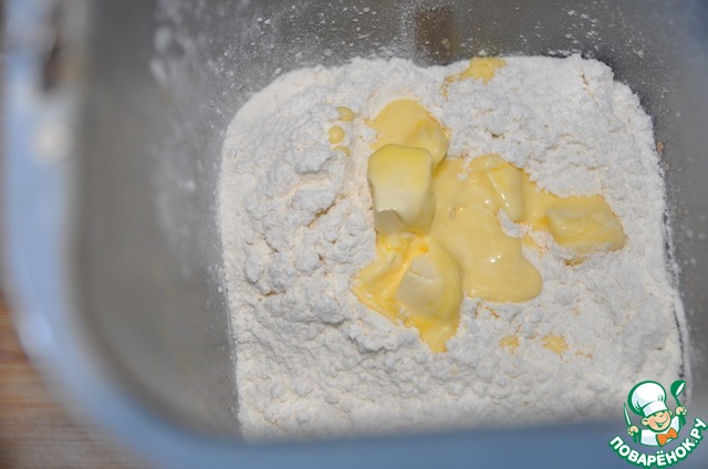 Добавляем соль, яйцо, муку и размягчённое сливочное масло.