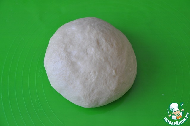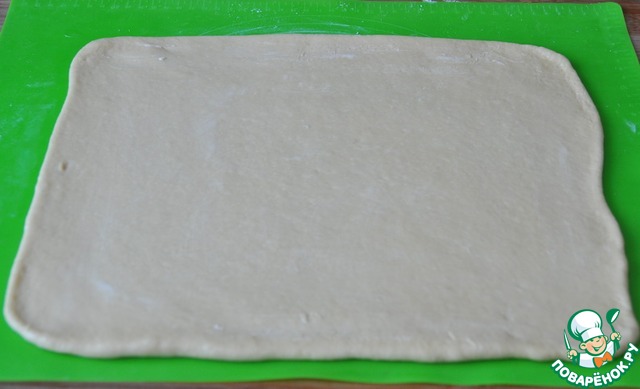 Раскатываем тесто в прямоугольный пласт, толщиной около 1 см. В моём случае пласт 30 на 40 см. Смазываем растопленным сливочным маслом.