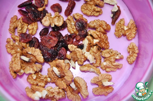 Берём грецкие орехи и вяленую клюкву, слегка измельчаем блендером.