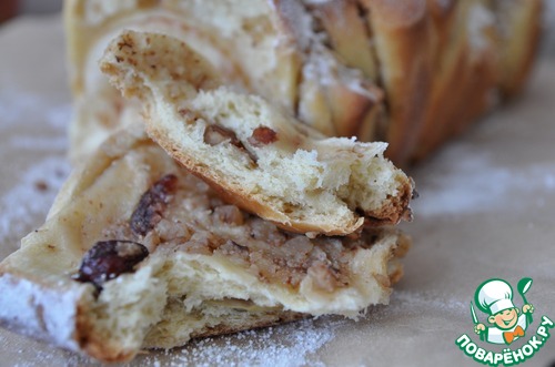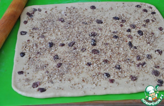 Посыпаем равномерно тесто коричневым сахаром, вяленой клюквой и измельчёнными орехами. Слегка прокатываем скалкой, чтобы начинка не осыпалась при формовке.