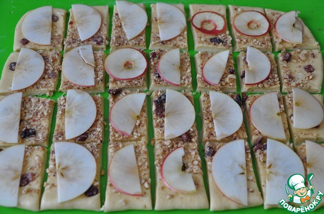 Режем тесто на прямоугольники, ориентируйтесь по форме, в которой будете выпекать, в моём случаем 5 на 7 см. Сверху каждого кусочка теста кладём пластинку яблока.