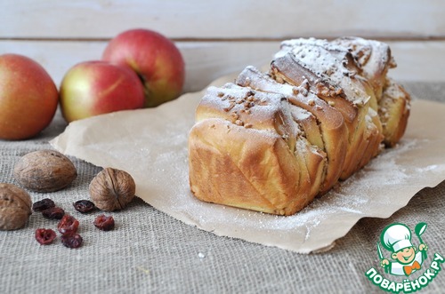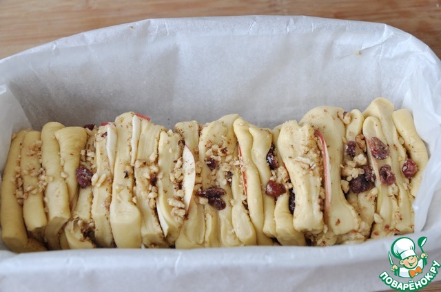 Последовательно кладём в форму все прямоугольнички теста с яблоками. Кладите неплотно, тесто ещё поднимется. У меня тесто подошло так хорошо, что некоторые кусочки сильно вылезли при выпечке. Последний кусочек положите "чистой" стороной к стенке. Накрываем форму полотенцем и даём подняться 20 минут.