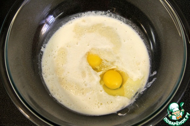 Добавляем сливки (или сгущеное молоко), соль, яйца и сахар.
