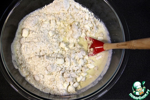 Следом добавляем смесь муки с маслом и перемешиваем.