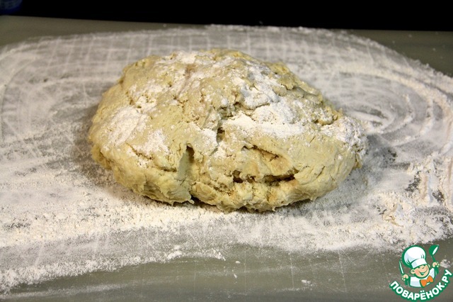Утром вынимаем тесто и кладем на стол, присыпанный мукой. Посыпаем сверху немного муки