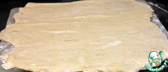 Достаем из холодильника остывшее тесто и раскатываем прямоугольник примерно 40 х 45 см.