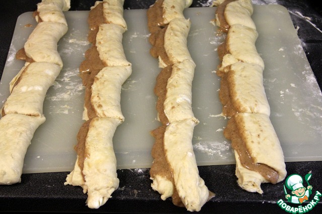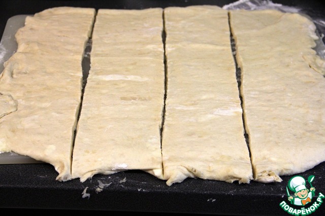 Скалкой слегка раскатать каждую трубочку и разрезать на 3 - 4 части