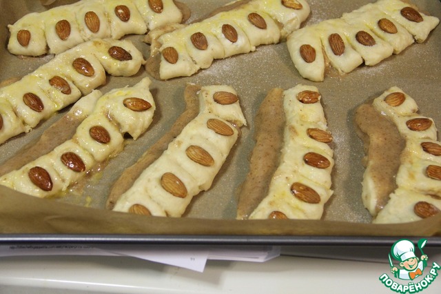 После того как тесто чуть поднялось, смазываем яйцом, кладем миндальный орех на каждый пальчик и посыпаем сверху сахаром.