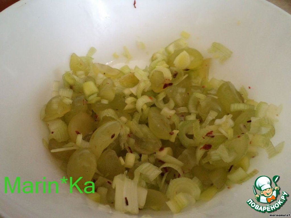 Сделаем сальсу. У меня зеленый виноград, поэтому я брала лук-порей. Если у вас темный, то берете красную луковицу - либо половинку, либо небольшую. Виноград режем на половинки, потом еще на половинки, чтобы помельче было. Туда добавляем мелко нарезанный лук-порей, перец чили, можно уже готовую приправку хлопьями, а можно и стручок нарезать, только семечки уберите. Добавляем ложку уксуса и соль, перемешиваем. Ставим в холодильник минут на 15-20 охладиться, промариноваться....