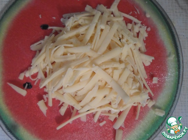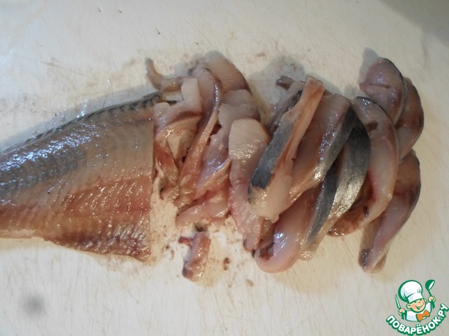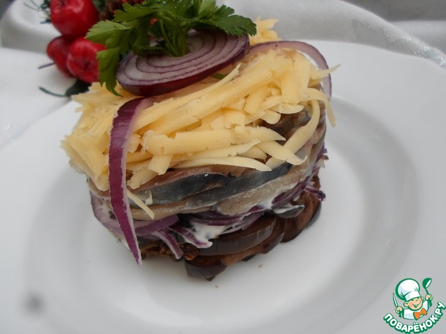 Так делаем со всеми слоями (я делала майонезную сетку только на баклажанах и луке, мне вполне хватило, т. к селедка была очень жирная). Итак 1 слой-баклажаны, 2-лук, 3-сельдь, 4-сыр.