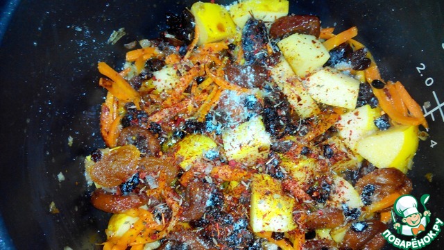 Наши сухофрукты, курагу, изюм и финики уже промытые и обсушенные добавляем в чашу мультиварки, далее солим по вкусу, и добавляем щепотку шафрана, еще раз перемешиваем.
