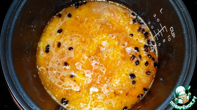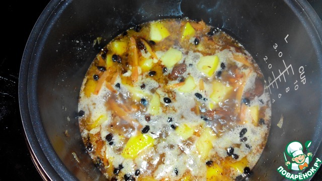 Добавляем рис, еще один стакан воды. Закрываем крышку мультиварки. Ставим режим "Экспресс варка" 30 минут.