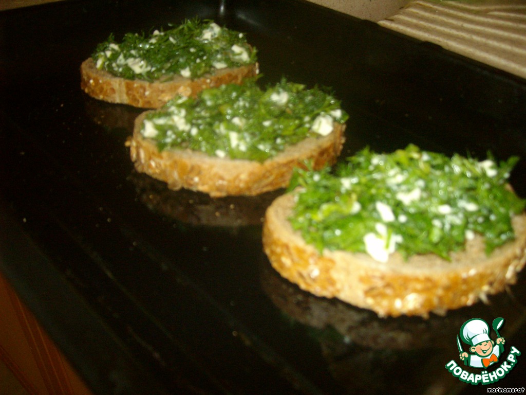 Хлебушек ставим в разогретую до 200C духовку, а в это время трем сыр на терке, мелко режем всю зелень, добавляем к сыру, туда отправляем 2 ст.л оливкового масла и перемешиваем. Достаем теплый хлебушек из духовки и кладем на него нашу начинку.