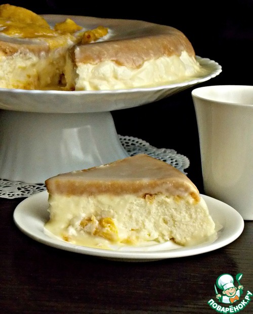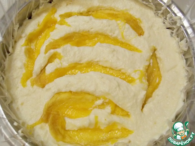 Отдельно взбить сливки и аккуратно перемешать. Выложить на застывшую основу. Сверху уложить дольки манго, утопить их и разровнять верх.