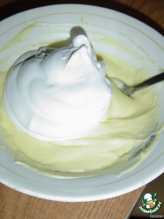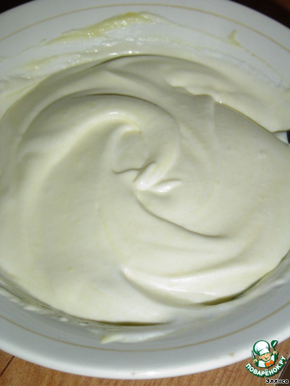 Белок взбиваем с оставшимся сахаром в крепкую пену, добавляем к крему, осторожно перемешиваем.
