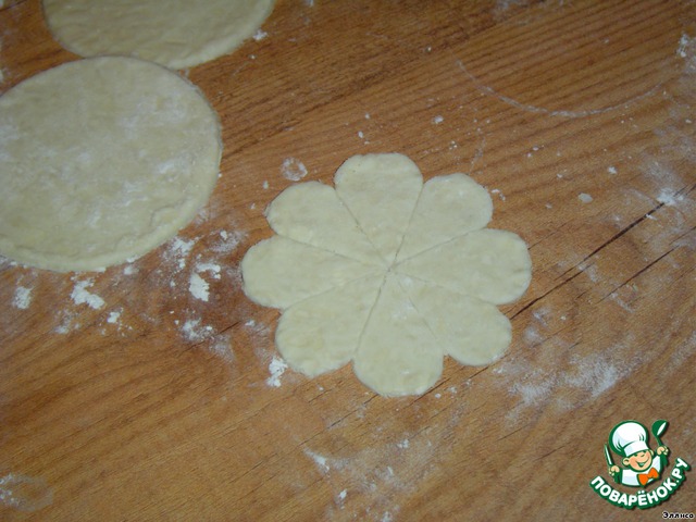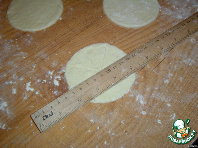 Раскатываем тесто, стаканом вырезаем круги и делим их на сегменты с помощью линейки.