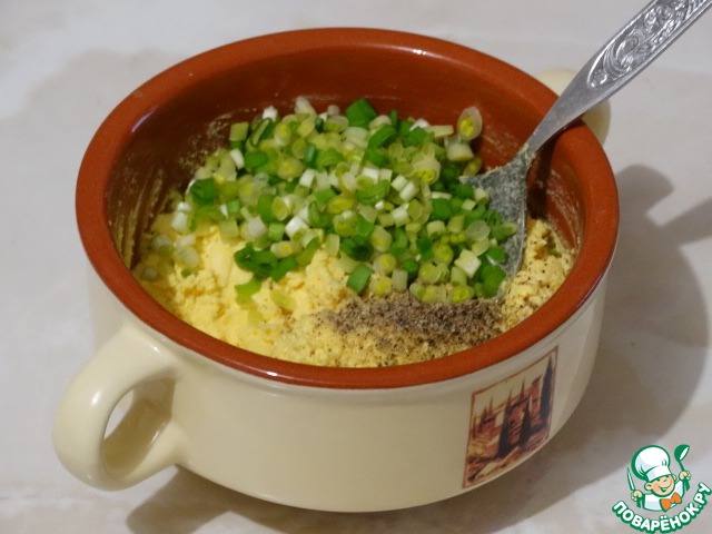 Из белков вырезаем чашечки для цветов, в серединку помещаем шарик сырной массы, тычинки и листья из зеленого лука.
