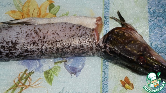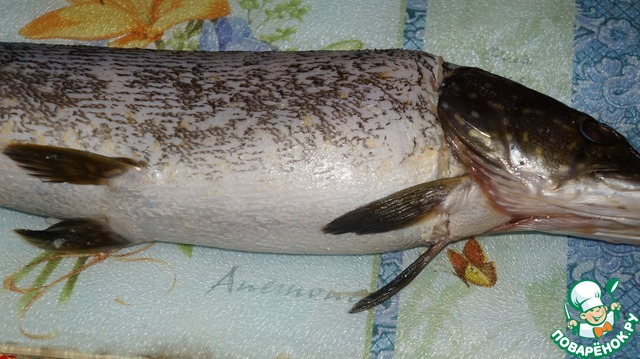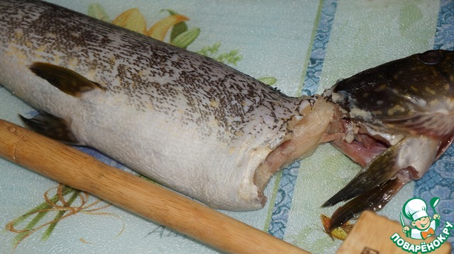 Берем нашу рыбку. Чистим ее. Вырезаем жабры. Отрезаем щуке голову, но не насовсем. А вот так.