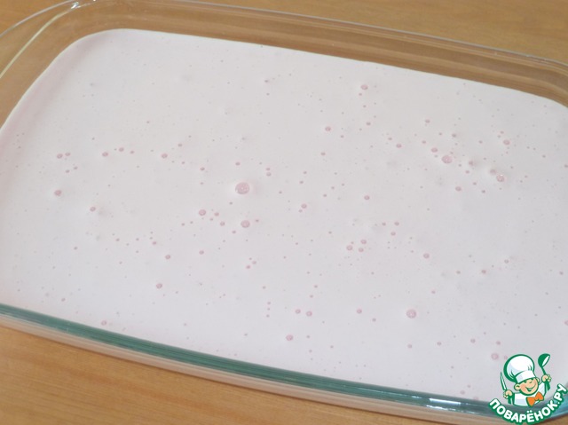 Вылить полученную смесь в прямоугольную, лучше стеклянную форму и оставить при комнатной температуре на 4 часа, затем убрать в холодильник.
