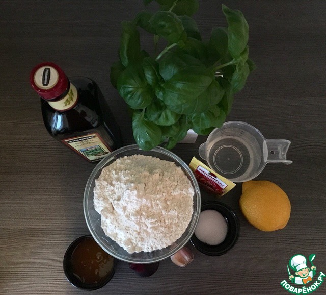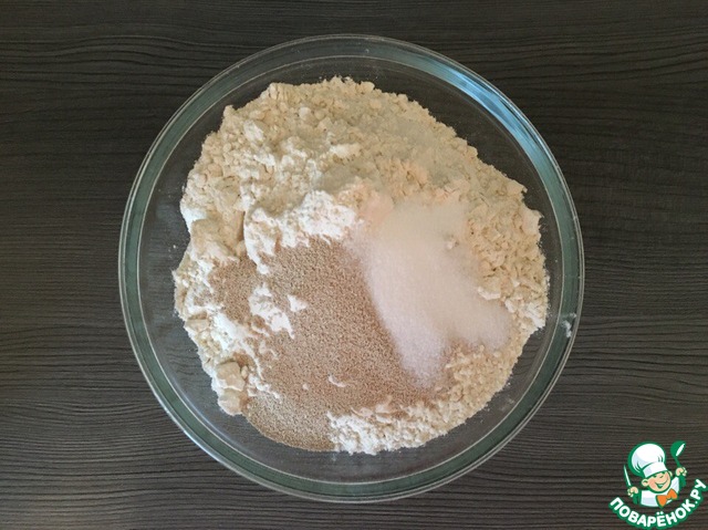 Тесто: В отдельной ёмкости смешайте муку, соль и сухие дрожжи до однородной массы. Добавьте получившуюся смесь к воде, так же добавьте оливковое масло и мёд.