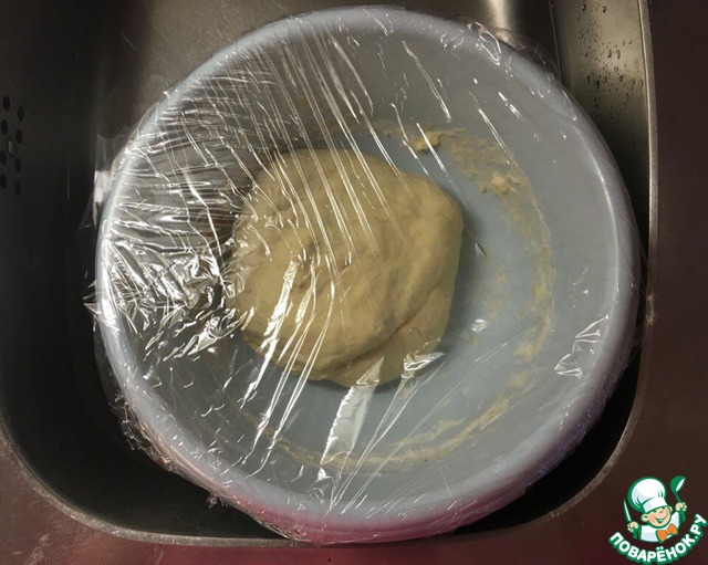 Закрыть пищевой плёнкой и поставить в тёплое место на 30 минут. Кто-то ставит к батарее, лично я решил вопрос так: налил тёплую воду в раковину и поставил туда ёмкость с тестом (правда разок пришлось воду поменять, так как она успела остыть).