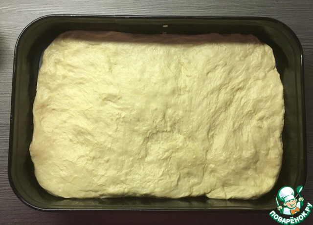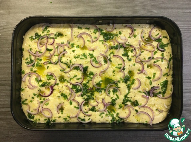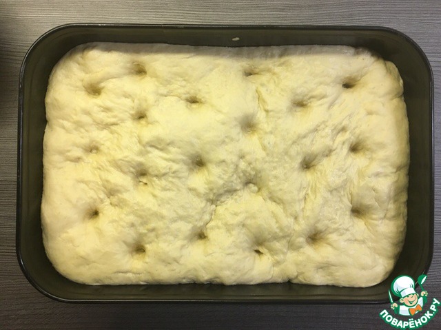 Возьмите большую форму для выпечки (у меня 23х33см). Хорошенько смажьте её оливковым маслом. Переложите подошедшее тесто в форму и распредилите его ровным слоем. Чтобы тесто не прилипало - обмакните пальцы в оливковое масло, либо в муку. Как только тесто будет лежать ровненько, накройте полотенцем и дайте дойти еще 30 минут.