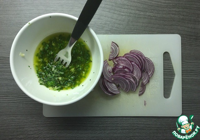 Соус: Смешайте оливковое масло, измельченный базилик, выдавленный чеснок и лимонный сок. Перемешайте и добавьте перца по вкусу.