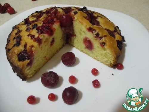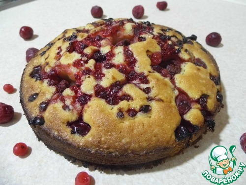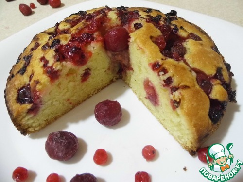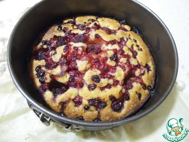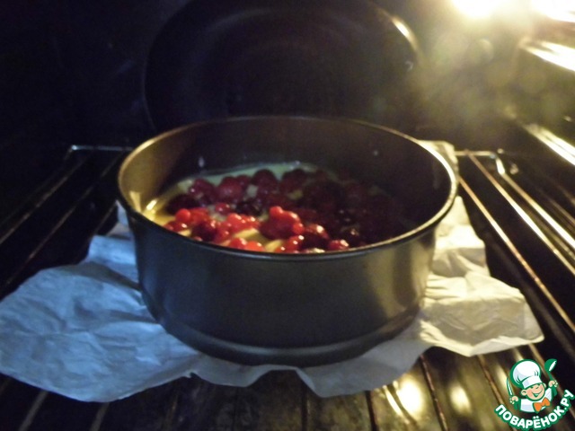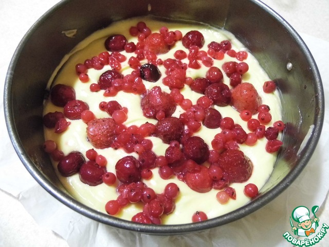 Сверху на тесто в произвольном порядке высыпаем ягоды, некоторые всаживаем поглубже ( в процессе выпекания они окажутся внутри пирога, будет очень эффектно выглядеть)