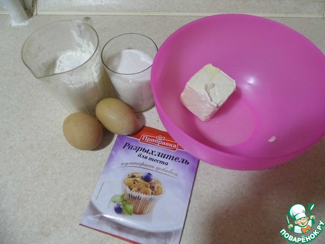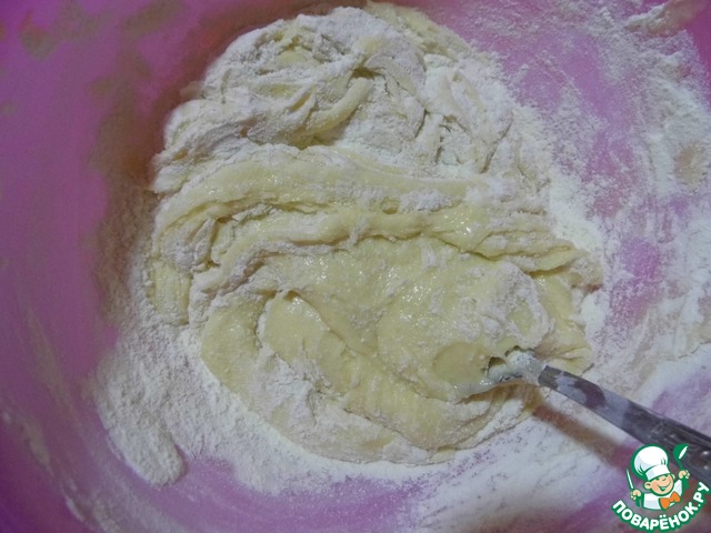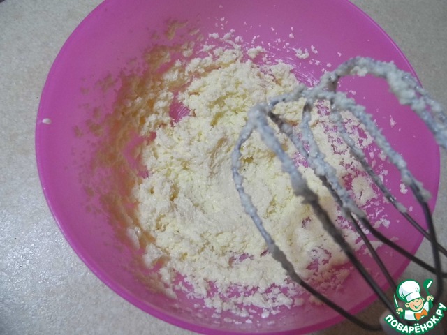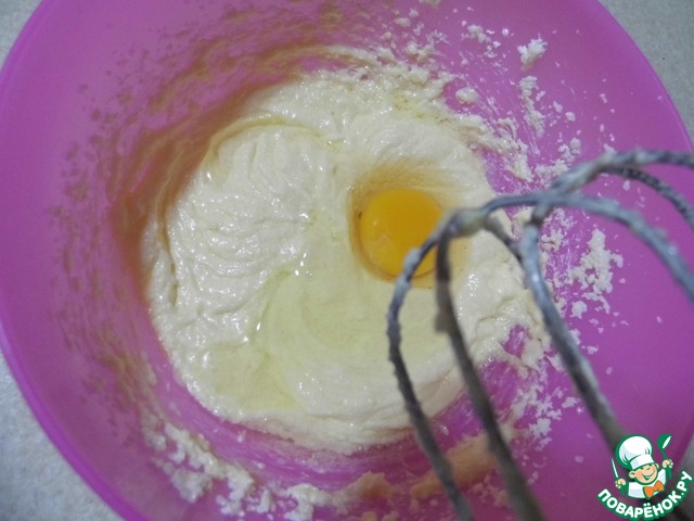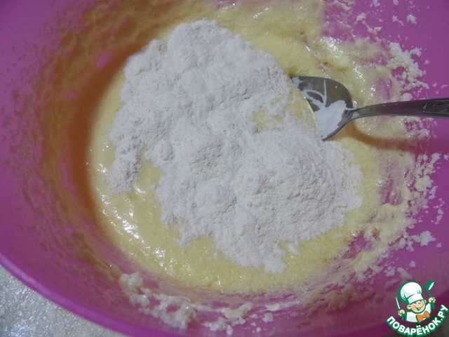 Муку смешиваем с разрыхлителем теста и по чуть-чуть всыпаем в смесь.