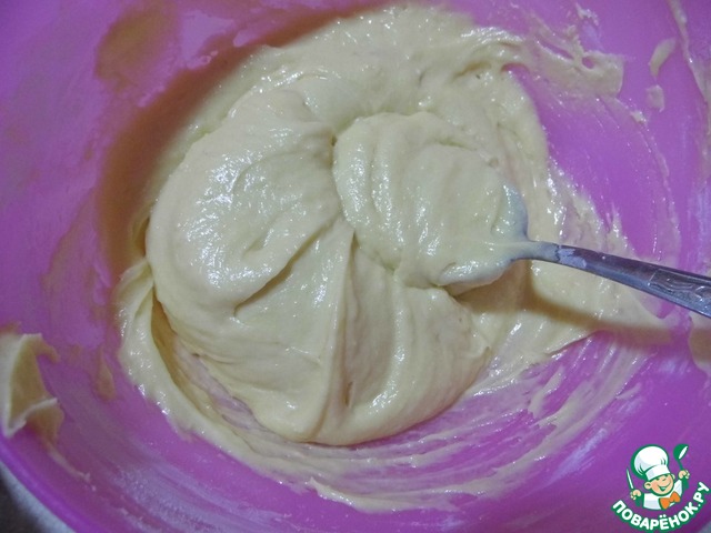 Пока не получится вот такое тесто, которое не будет спадать с ложки.
